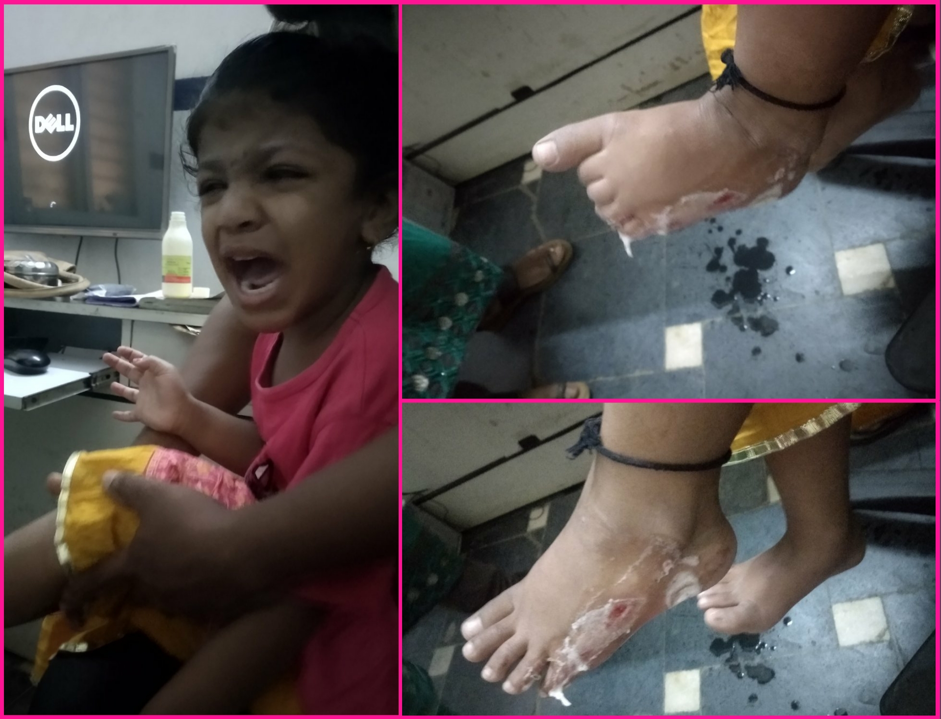 Incident at Baji junction…..a small baby of 3 years is going to school along with her father on a cycle….she suddenly kept her legs in a wheel ….Her foot was completely injured… immediately she had taken to the nearest hospital and necessary treatment is taken…she is safe now finally….