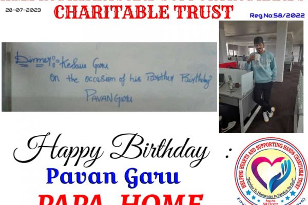 Uncategorized Happy Birthday Pavan Garu. admin3 years ago3 years ago01 mins mins Food Donation At PAPA Home. Read More